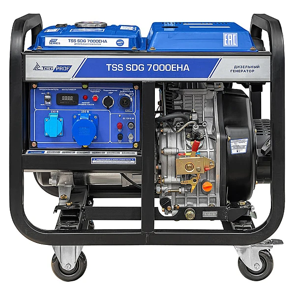 Дизельный генератор TSS SDG 7000EHA - современная экономичная электростанция мощностью 6.5 кВт. Совместимость с системами автозапуска делает эту модель подходящим выбором для резервного энергоснабжения жилого или коммерческого объекта, а встроенный транспортировочный комплект из колес и рукояток упрощает работу с агрегатом на выезде и при частых перестановках, например, на стройплощадке.