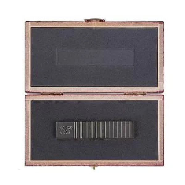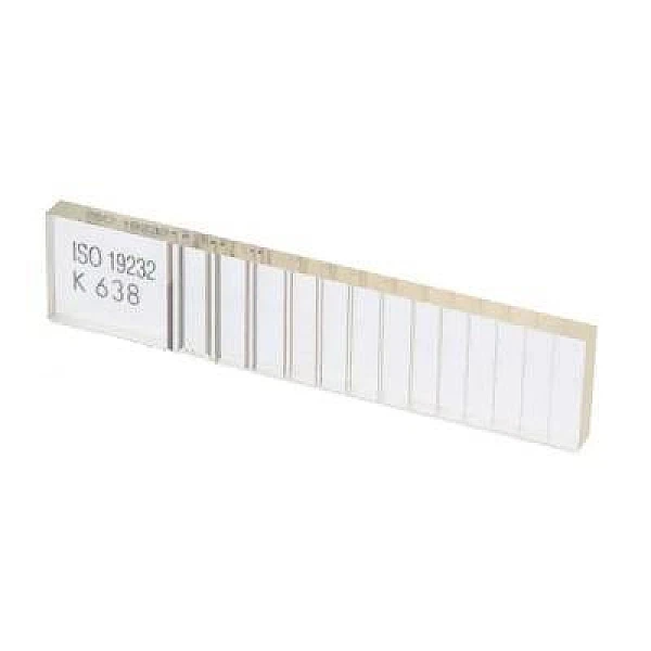 Эталон изготовлен из жесткого прозрачного пластика внутри которого размещены пары проволок. Расстояние между проволоками в паре равно их диаметру, от пары к паре диаметр и расстояние между проволоками уменьшается.