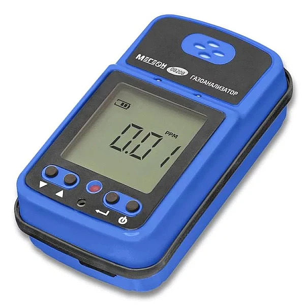 Газоанализатор МЕГЕОН 08208 – переносное контрольно-измерительное устройство, которое применяется для изучения состава и концентрации озона в газовоздушной смеси. Принцип работы инструмента основывается на съеме параметров электрического тока, вырабатываемого электрохимической ячейкой в процессе химического взаимодействия с участием элементов анализируемого газообразного вещества. Тактовые кнопки управления размещены на лицевой стороне. Три вида сигнализирования: визуальный, звуковой и вибрационный. Два порога срабатывания тревожного сигнала.