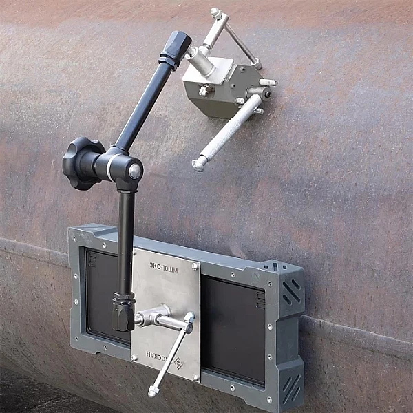 Крепление состоит из трех частей: стального основания, шарнирного штатива и мощного выключаемого магнита грузоподъемностью 100 кг. Через стальное основание детектор в защитном кожухе ЭКО-10У соединяется со штативом. Штатив состоит из двух сегментов и трех шарнирных узлов, что позволяет гибко регулировать положение детектора в пространстве под необходимым углом. Фиксация и ослабление всех шарнирных узлов осуществляется одной поворотной ручкой. Магнит обеспечивает надежность фиксации детектора на объекте контроля. Включение и выключение магнитного поля осуществляется поворотом рукоятки.