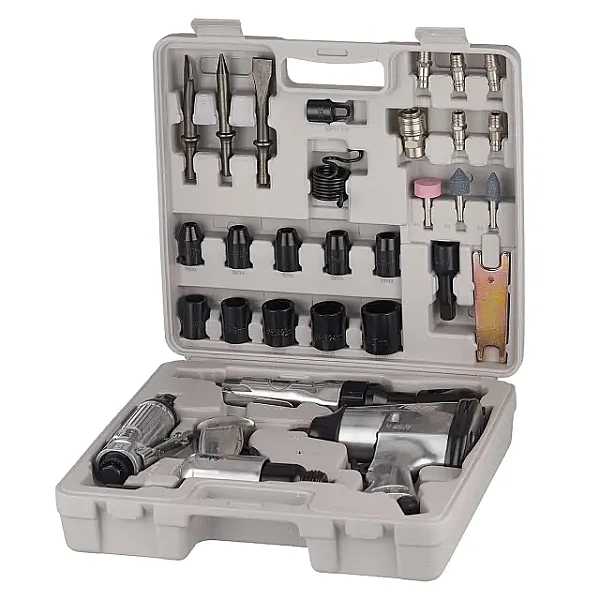 В комплект набора входят: пневмодолото, 3 зубила 120 мм с круглым хвостовиком, пневмогайковерт, 10 головок 1/2", 1 угловой пневмогайковерт, пневмошлифмашина, 3 шлифкамня 6 мм, 1 ключ шестигранный 6 мм, 1 разъем рапид муфта, 2 гаечных ключа, 1 возвратная пружина, 6 разъемов рапид штуцер, 1 удлинитель 1/2" на 75", 1 масленка, 1 переходник 3/8" на 1/2"