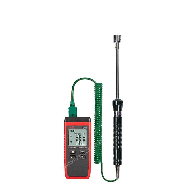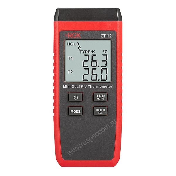 За счет небольшого веса компактный двухканальный цифровой термометр RGK CT-12 с поверхностным зондом TR-10S удобен для проведения длительных инспекций в полевых условиях, легко помещается в карман одежды или сумки. С большого дисплея показания считываются легко и без путаницы между каналами. Корпус прибора выполнен из прочного пластика, снабжен рельефными участками для надежного захвата и выдерживает падение с метровой высоты.
