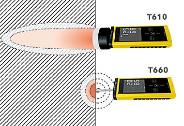 Благодаря комбинированному измерению приповерхностной влажности с T660 и подповерхностной влажности с T610 , можно различить, сузить и классифицировать сложные корреляции, например, гигроскопические явления влажности, возникающие в результате засоления или утечек. В ходе этого T660 захватывает верхние два-четыре см строительного материала, а T610 измеряет объемные значения влажности до глубины 30 см.